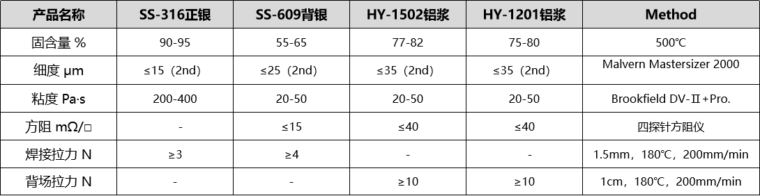 太阳能导电浆料是金属电子浆料的一个重要种类。目前分为铝浆、背银和正银三种。我们基于铝浆和背银的技术积累,以及对太阳能电池技术发展方向的把握,成功研制了高效太阳能电池正银浆料,并通过行业专家和客户认证。目前公司已经形成了以HY系列为代表的太阳能电池背面铝浆、背钝化铝浆和N型铝浆;SS系列为代表的正面银浆,主栅正银和背面银浆两大产品体系20多种产品,主要应用于太阳能电池、片容、片感、片阻等。