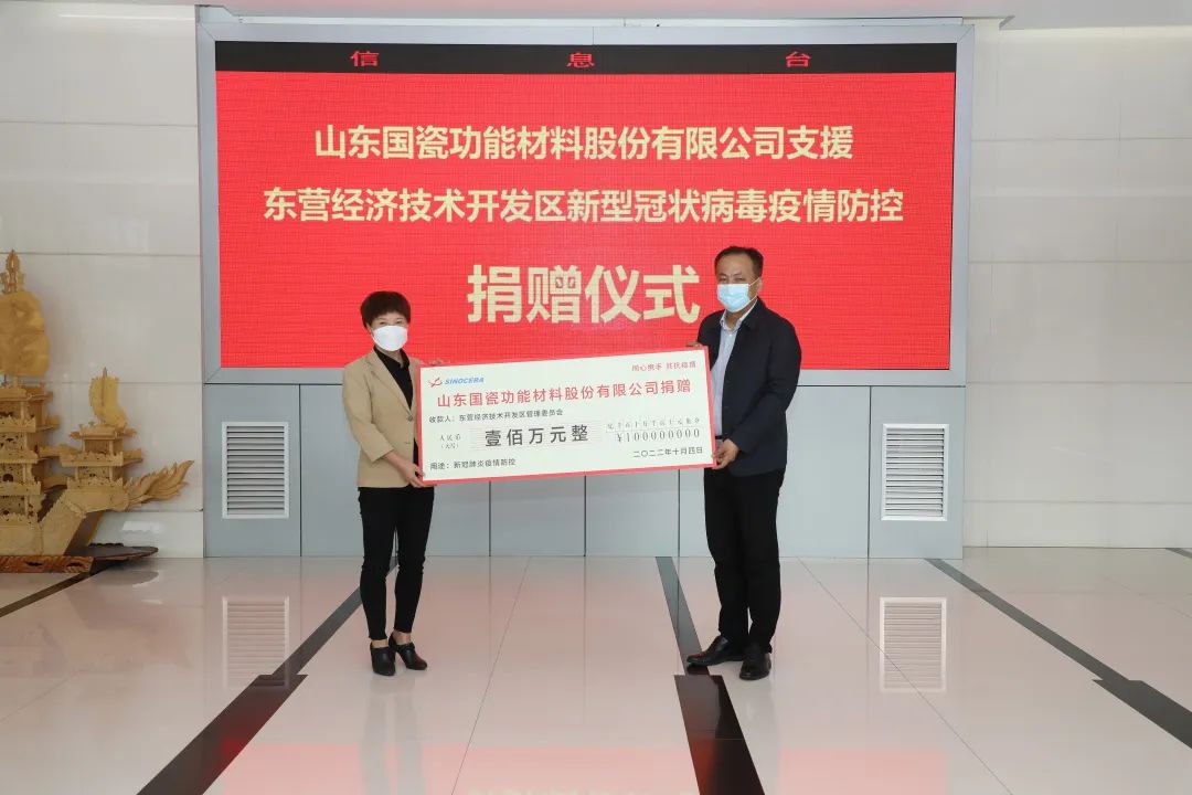 10月4日上午,山东国瓷功能材料股份有限公司向东营经济技术开发区捐赠100万元,用于开发区疫情防控工作。东营市委副秘书长、开发区党工委副书记曹国华,东营经济技术开发区党工委副书记刘军代表开发区接受捐赠并颁发捐赠证书。公司副总经理、董秘许少梅等参与捐赠活动。